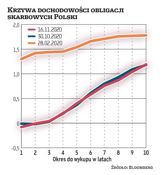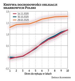 „Rentowność amerykańskich obligacji skarbowych może w najbliższym czasie przebić 1 proc., ale ich trwała przecena w tym roku jest mało prawdopodobna. Rosnąca liczba zachorowań na Covid-19 będzie ciążyła fundamentom gospodarczym. Krzywa rentowności zacznie się z czasem wystramiać, ale w najbliższym kwartale nie będzie wyraźnego trendu" – napisali kilka dni temu analitycy rynku długu w Societe Generale. Jak tłumaczyli, druga fala pandemii Covid-19 będzie skłaniała banki centralne do utrzymywania ultrałagodnej polityki pienieżnej, a być może nawet do jej dalszego łagodzenia. Europejski Bank Centralny już zasygnalizował, że w grudniu zdecyduje się na zwiększenie swoich programów skupu obligacji na rynku wtórnym. Tym zresztą można tłumaczyć fakt, że rentowność obligacji skarbowych niektórych państw strefy euro – np. Grecji – ustanowiły w ostatnich dniach nowe, historyczne minima. W Polsce czynnikiem ograniczającym potencjał do przeceny obligacji skarbowych pozostaje z kolei silny popyt banków na te papiery.