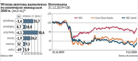 Wynik odsetkowy zmalał o 3,4 proc., do 35,7 mld zł, zaś prowizyjny urósł o 8,7 proc., do 10,8 mld zł. Całkowite przychody operacyjne netto wyniosły 50,6 mld zł, co oznacza spadek o 6,1 proc. rok do roku. Koszty administracyjne (bez amortyzacji) zmalały o 1,9 proc., do 26,2 mld zł. Innym, poza słabszym wynikiem odsetkowym, elementem decydującym o pogorszeniu zysku w tym roku są rosnące odpisy kredytowe – w pierwszych dziewięciu miesiącach wyniosły 9,2 mld zł, czyli urosły rok do roku o 32 proc. Ostatnie miesiące przyniosły nieco optymizmu, bo odpisy nie rosły już tak mocno, a wynik odsetkowy przestał się pogarszać. Zysk netto w samym wrześniu znowu był jednak słaby: wyniósł tylko 269 mln zł, czyli spadł o 75 proc. rok do roku. Dla porównania w sierpniu – najlepszym od dawna miesiącu pod względem zysku – sektor miał 1,3 mld zł zarobku netto. Wynik z odsetek wyniósł 3,66 mld zł, czyli spadł rok do roku o 3,4 proc. i nieznacznie obniżył się wobec rezultatu z lipca i sierpnia, gdy wyniósł po 3,72 mld zł (w przeliczeniu na liczbę dni nawet lekko się poprawił). Dochód z opłat i prowizji we wrześniu sięgnął 1,27 mld zł, czyli urósł rok do roku aż o blisko 16 proc., zwiększył się także w porównaniu z sierpniem, gdy wyniósł blisko 1,2 mld zł. Koszty administracyjne wyniosły 2,65 mld zł, czyli spadły o 5 proc. rok do roku, były niemal identyczne jak w sierpniu. Wyraźnie podskoczyły znowu odpisy kredytowe. Wyniosły 1,09 mld zł, czyli urosły rok do roku o prawie 60 proc. i zwiększyły się także wobec sierpnia i lipca, gdy było to odpowiednio „tylko" 709 mln zł i 463 mln zł. Rentowność kapitałów własnych sektora bankowego spaść może w tym roku do około 4 proc., dodatkowo banki nie wypłacają dywidend, więc notowania WIG-banki obniżyły się od początku roku o 44 proc. I to pomimo 9-proc. zwyżki z poniedziałku, którą napędziły pozytywne informacje o szczepionce na koronawirusa, które opublikował koncern Pfizer. Wyhamowanie pandemii to szanse na lepszą kondycję firm i mniejsze odpisy kredytowe banków, a w dalszej kolejności możliwość normalizacji polityki pieniężnej.