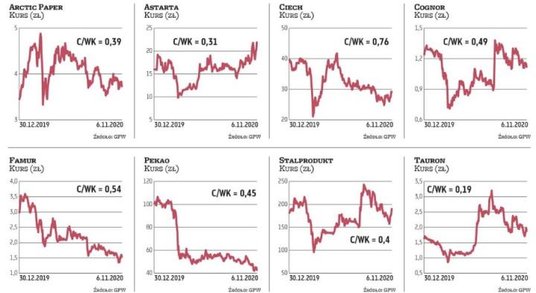 Wyceny na warszawskiej giełdzie wydają się względnie niskie, jeśli popatrzymy na wskaźnik ceny do wartości księgowej. Jego średnia dla indeksu WIG wynosi zaledwie 1,06. Aż 58 proc. spółek z rynku głównego notowanych jest poniżej swojej wartości księgowej (czyli z C/WK poniżej 1). W uproszczeniu oznacza to, że możemy nabyć ich akcje za mniej, niż jest wart posiadany przez nie majątek. Teoretycznie takie spółki można uznać za atrakcyjne, tyle że zwykle wiąże się to z niepewnymi perspektywami ich rozwoju, co automatycznie oznacza większe ryzyko.
