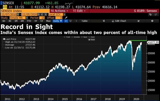 Sensex osiąga ponad 500 punktów w transakcjach otwarcia, Nifty przekracza 12 000 punktów na fali pozytywnych globalnych informacji.
