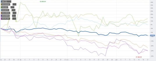 Jeśli chodzi o sześć indeksów sektorowych, które w analizowanym okresie są na plusie, to mówimy o następujących branżach: górnictwo (11,1 proc.), leki (6,6 proc.), motoryzacja (6,2 proc.), budownictwo (4,6 proc.), spółki ukraińskie (1,5 proc.) oraz informatyka (1,1 proc.). Na drugim biegunie są następujące sektory: odzież (-12,4 proc.), banki (-19,8 proc.), chemia (-21,8 proc.), paliwa (-25,5 proc.) oraz energetyka (-28,5 proc.). A skoro już mowa o maruderach, to dodajmy, że 160 spółek było w analizowanym okresie słabsza od WIGu. Średnia strata na ich akcjach wynosi -23,7 proc. i waha się od -9,4 proc. (ERG) do -62,6 proc. (Elektrobudowa). Ponad 20 proc. straciło 96 spółek, ponad 30 proc. 44, a ponad 40 proc. 10. W tej dziesiątce, oprócz wspomnianej Elektrobudowy, znalazły się: Altus TFI, Agora, Mex Polska, Trakcja, Unimot, Lotos, Elzab, CFI i Rafako.
