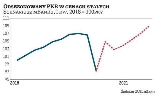 Na rewizję prognoz na cały 2020 r. zdecydowali się jednak jak dotąd nieliczni ekonomiści, głównie najwięksi optymiści. Przykładowo analitycy z banku Pekao, którzy jeszcze niedawno szacowali, że PKB spadnie w tym roku o 2,4 proc., obecnie oczekują zniżki o 3 proc. Większość ekonomistów już wcześniej miała takie oczekiwania na ten rok. I nawet jeśli pod wpływem wydarzeń z ostatnich tygodni spodziewają się większego niż wcześniej spadku PKB w IV kwartale, to jednocześnie wskazują, że lepszy od ich oczekiwań był III kwartał. – Szacujemy, że PKB w minionym kwartale spadł o 1,8 proc. rok do roku, zamiast o 3,3 proc. To w dużej mierze zasługa odbicia konsumpcji, której roczna dynamika zbliżyła się już do 0 – mówi „Parkietowi" Marcin Mazurek, główny ekonomista mBanku. W rezultacie, choć zespół analityków mBanku spodziewa się obecnie spadku PKB w IV kwartale o 4 proc. rok do roku zamiast o 2,9 proc., to prognozę na 2020 r. utrzymał bez zmian. Nadal oczekuje spadku aktywności w gospodarce o 3,1 proc.