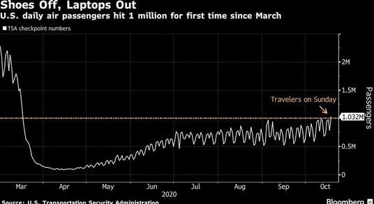 Zniszczona przez wirusy branża lotnicza osiągnęła kamień milowy w niedzielę, przewożąc ponad 1 milion pasażerów po raz pierwszy od siedmiu miesięcy. Punkty kontroli bezpieczeństwa na lotniskach w USA obsłużyły 1031505 osób, czyli 39,6% równoważnego dnia w 2019 r., Zgodnie z danymi przeprowadzonymi przez Administrację Bezpieczeństwa Transportu (TSA). Kilka najbardziej ruchliwych dni od połowy marca miało miejsce w ciągu ostatnich dwóch tygodni, a liczba pasażerów stopniowo rosła, ale to niewielka ulga dla branży, która wciąż chwieje się po pandemii koronawirusa. Jeśli poziom niedzielny zostałby utrzymany przez cały rok, spowodowałoby to z grubsza powrót branży do poziomów ostatnio obserwowanych 36 lat temu, według Airlines for America, zajmującej się dużymi przewoźnikami – pisze Bloomberg.