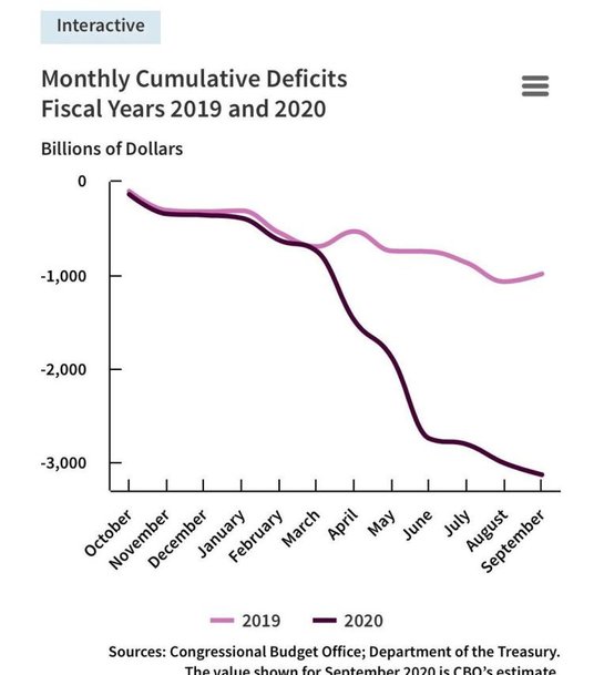 Oczekiwano olbrzymich liczb, ale wciąż oszałamiających, ponad dwukrotnie przekraczających poprzedni rekord deficytu wynoszący 1,4 biliona dolarów, który został zarejestrowany podczas pierwszego roku urzędowania prezydenta Baracka Obamy podczas Wielkiej Recesji w 2009 roku. Przychody również wpłynęły na ponury obraz fiskalny, spadając o 44 miliardy dolarów do 3,4 biliona dolarów, ponieważ wpływy z podatku dochodowego spadły o prawie 16 proc., gdy wzrosła stopa bezrobocia. Podatki dochodowe od osób prawnych spadły o 21 proc., mimo że podatki od wynagrodzeń na ubezpieczenie społeczne i opiekę medyczną wzrosły o 5 proc.