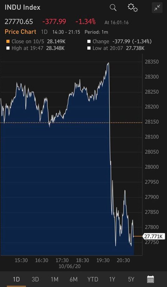 We wtorek, w regularnych obrotach, Dow Jones Industrial Average stracił 375 punktów po tym, jak Trump napisał na Twitterze, że Biały Dom wstrzymuje rozmowy z Demokratami na temat drugiej umowy stymulacyjnej na koronawirusa. Na początku sesji akcje zyskały na wartości w nadziei, że pojawi się drugi pakiet pomocy, który wesprze rynki w obliczu pandemii.