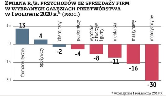 Najmocniej ucierpiały usługi bezpośrednio zablokowane przez restrykcje (zwłaszcza hotele i restauracje, turystyka oraz transport pasażerski), większość przemysłu (z wyjątkiem gałęzi wytwarzających dobra pierwszej potrzeby), a także handel, który spadku tradycyjnej sprzedaży nie był w stanie w pełni zrekompensować zwiększonym popytem w kanałach zdalnych. Biorąc pod uwagę dane o przychodach ze sprzedaży firm z poszczególnych sekcji gospodarki, w I półroczu największym przegranym kryzysu okazała się branża hotelarsko-gastronomiczna, gdzie obroty firm spadły średnio aż o blisko 30 proc. rok do roku.