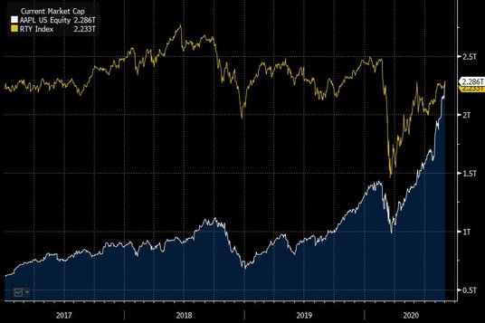 Kapitalizacja Apple sięgnęła we wtorek 2,286 biliona dolarów. Tymczasem indeks małych spółek Russell 2000 był wart 2,233 biliona.