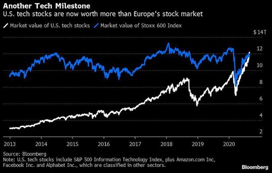 Amerykańskie akcje spółek technologicznych przewyższyły wartość rynkową całego europejskiego rynku akcji po gwałtownym wzroście przez całe lato z powodu zainteresowania inwestorów zagranicznych, poinformował Bank of America w nocie do klientów. Aby podkreślić szybkość, z jaką rosną akcje spółek technologicznych bank zauważył, że kapitalizacja rynkowa Europy w 2007 roku była około czterokrotnie większa niż sektor.
