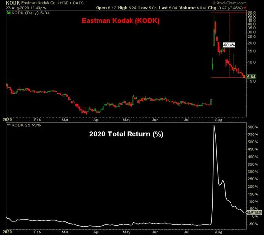 Tego samego dnia dyrektorzy Kodaka James Continenza, David E. Bullwinkle, Roger W. Byrd i Randy Vandagriff otrzymali opcje na zakup prawie dwóch milionów akcji zwykłych Kodaka po cenach wahających się od 3,03 do 20,25 USD. Po oficjalnym ogłoszeniu pożyczki rządowej w dniu 28 lipca 2020 r., Akcje Kodaka wzrosły do ??7,94 USD, czyli 203% w stosunku do poprzedniego dnia na poziomie 2,62 USD. 29 lipca 2020 r. Akcje Kodaka nadal rosły, zamykając się na poziomie 33,20 USD po osiągnięciu dziennego maksimum na poziomie 60 USD.