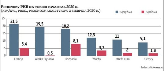 Mediana prognoz dla Niemiec mówi o wzroście PKB w trzecim kwartale wynoszącym 6,2 proc. kw./kw. W lipcu znajdowały się one w przedziale od 2,2 proc. do 5,5 proc., a w sierpniu już między 1,8 proc. a 9,1 proc. W przypadku Francji mediana prognoz wskazuje na wzrost w trzecim kwartale wynoszący 11,5 proc. Przewidywania analityków wahały się jednak w lipcu od 0,3 proc. do 6,2 proc., a w sierpniu od 5,4 proc. do aż 21,5 proc. Mediana prognoz dla brytyjskiego PKB na trzeci kwartał wynosiła 13,4 proc. kw./kw. Prognozy lipcowe były rozstrzelone od 11,7 proc. do 19,9 proc., a sierpniowe od zaledwie 0,3 proc. do 19,5 proc.