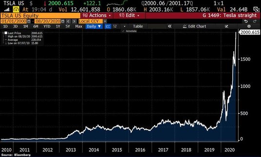 Całkowite szaleństwo! Tesla osiąga 2000 dolarów za akcję po 378-proc. wzroście w tym roku przed splitem akcji. Kurs wzrósł o 40 proc. od czasu ogłoszenia podziału akcji bez żadnego innego poważnego katalizatora w międzyczasie. Apple, który ogłosił podział akcji na dwa tygodnie przed Teslą, zyskał od tego czasu 20 proc.