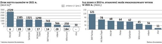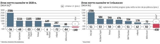Tąpnięcie zysków to skutek pandemii: presji na przychody (niższy wynik odsetkowy po cięciu stóp procentowych przez RPP) i wzrostu kosztów ryzyka kredytowego (na razie to głównie rezerwy na oczekiwane dopiero straty). Ze średniej prognoz Bloomberga wynika, że w tym roku najmocniej mogą spaść zyski Millennium i mBanku, odpowiednio o ponad 80 proc. i 70 proc., do 88 mln zł i 287 mln zł, czego głównym powodem (poza pandemią) są zwiększające się rezerwy na hipoteki frankowe. Stosunkowo niewiele, bo po około jedną trzecią, spaść mają zyski PKO BP i ING Banku Śląskiego, odpowiednio do 2,59 mld zł i 1,11 mld zł. Nieco poprawić zysk może BNP Paribas, którego wyniki w 2019 r. obciążone były kosztami fuzji. Biorąc pod uwagę oczekiwaną skalę spadku zysków w tym roku i odbicia w przyszłym, najlepiej powinny sobie poradzić ING Bank Śląski i PKO BP, których zyski w 2021 r. mogą być na poziomie odpowiednio 78 proc. i 67 proc. rezultatów z niedotkniętego pandemią 2019 r. W Pekao i Santanderze wskaźnik ten może wynieść około 62 proc. W najgorszej sytuacji jest Alior, który w tym roku może mieć dużą stratę, nawet ponad 500 mln zł (średnia prognoz jeszcze nie zdążyła się dostosować do najnowszych informacji o dużych odpisach).