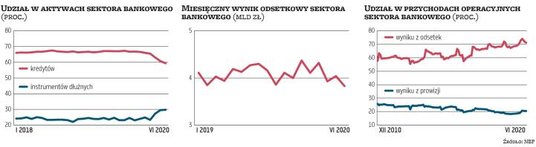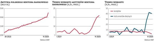 Jedną z najważniejszych zmian jest szybki wzrost aktywów sektora bankowego. Na koniec II kwartału były wyższe niż rok temu o 16 proc. (przed pandemią aktywa rosły po około 6–7 proc.). Tylko przez kwartał zwiększyły się o blisko 160 mld zł, czyli 7,5 proc., do 2,27 bln zł. Zmienia się jednak czynnik decydujący o tym wzroście. O ile jeszcze w ubiegłym roku i przed pandemią przyrost aktywów wynikał głównie ze wzrostu kredytów (miesięcznie po kilka mld zł), o tyle teraz za wzrost aktywów odpowiadają głównie instrumenty dłużne. Na koniec marca były warte już 675 mld zł, o 41 proc. więcej niż rok temu, tylko w tym roku ta kategoria aktywów sektora spuchła aż o 217 mld zł (kredyty urosły tylko o 16 mld zł), bo dzięki dużej nadpłynności banki obejmowały papiery dłużne, głównie te gwarantowane przez państwo (emisje PFR i BGK). W efekcie udział instrumentów dłużnych w aktywach sektora urósł do 29,7 proc. na koniec czerwca z 23 proc. pół roku wcześniej. Udział kredytów zmalał do 59,4 proc. z 66,8 proc.