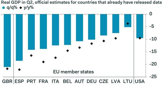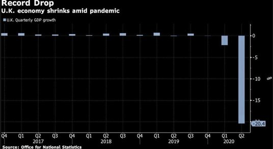 Wielka Brytania ma najgorszy kryzys gospodarczy w Europie z szokującym spadkiem o 20,4% w kwartale. Ten wynik wyprzedził kryzys w USA i oficjalnie pchnął kraj w pierwszą recesję od 2009 roku. Niepowodzenie rządu w zakresie wczesnego zablokowania, a następnie szybkiego wyeliminowania Covid-19 jest jednym z największych współczesnych błędów w polityce makroekonomicznej. Bank of England powiedział, że Wielka Brytania może zmierzyć się z największym załamaniem gospodarczym od ponad 300 lat z powodu blokady koronawirusa.