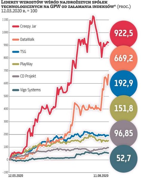 Najdroższe na rynku głównym są akcje odzieżowego LPP (kurs oscyluje w okolicach 7200 zł), oferującego świadczenia pozapłacowe Benefitu (808 zł) i producenta słodyczy – grupy Wawel (ponad 570 zł). Tuż za nimi plasują się reprezentanci nowych technologii. Ich wyceny, od momentu marcowego załamania na rynkach, dostały dodatkowego paliwa do wzrostów, bo sektor IT jest beneficjentem trwającej pandemii. W efekcie udział spółek technologicznych w grupie najdroższych emitentów rośnie. Mowa tu m.in. o Vigo Systems, 11 bit studios, PlayWayu, Ten Square Games, Creepy Jar (NewConnect), CD Projekcie czy Comarchu.