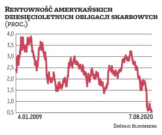 W przypadku tych pierwszych można już mówić o euforii, szczególnie patrząc na rynek złota, ale i amerykańskie obligacje skarbowe także notują rekordowo wysokie ceny (rentowność zbliża się do 0,5 proc.). Wypada tylko czekać, aż euforia pojawi się również na napompowanych rynkach akcji. Jednym i niemal jedynym przegranym jest dolar, którego indeks znalazł się już poniżej dołków z grudnia ubiegłego roku i marca 2020 r., i jest na poziomie najniższym od ponad dwóch lat, co oczywiście podkręca notowania w pozostałych segmentach rynku finansowego. Sytuacja, w której w górę idą notowania „wszystkiego", nie może trwać wiecznie, a powodem jej wystąpienia jest zalewanie rynków pieniądzem. Deprecjacja dolara, którego mamy nadmiar, potwierdza tę tezę. Fed ściga się z amerykańskim rządem o palmę pierwszeństwa w dostawach „zielonych". Czekamy teraz na wynik targów o to, ile mają dodatkowo dostawać bezrobotni w USA, i wiele wskazuje, że będzie to 400+ wypłacane przez kolejne miesiące. W tym kontekście sygnały o możliwym pogorszeniu się sytuacji na rynku pracy nie wydają się groźne.