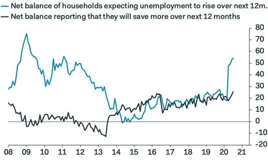 Najnowsze badanie nastrojów gospodarczych za lipiec pokazuje, że gospodarstwa domowe w Wielkiej Brytanii są obecnie najbardziej zaniepokojone wzrostem bezrobocia od lutego 2011 r. (rzadko się mylą) i zamierzają zaoszczędzić większą część swoich dochodów w przyszłości. Obawy przed bezrobociem są jak najbardziej uzasadnione. Szacuje się, że milion zwolnionych brytyjskich pracowników jest zagrożonych bezrobociem po zakończeniu programu urlopowego rządu Wielkiej Brytanii w październiku, według najnowszej analizy przeprowadzonej przez Resolution Foundation.