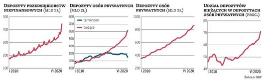 Od lutego ubyło równe 40 mld zł pieniędzy z lokat klientów prywatnych, na koniec czerwca było ich 250 mld zł. Część z nich z trafiła do depozytów bieżących, dzięki czemu łączna wartość pieniędzy osób indywidualnych systematycznie rośnie i wynosi 865 mld zł (ponad 9 proc. rok do roku). W efekcie udział depozytów bieżących klientów prywatnych (czyli głównie nieoprocentowanych rachunków rozliczeniowych, ale są w nich także konta oszczędnościowe, mające nieco lepsze stawki) w łącznych depozytach sektora bankowego rośnie i w czerwcu sięgnął rekordowych 71 proc. (jeszcze trzy lata i pięć lat temu było to odpowiednio 56 proc. i 49 proc.).