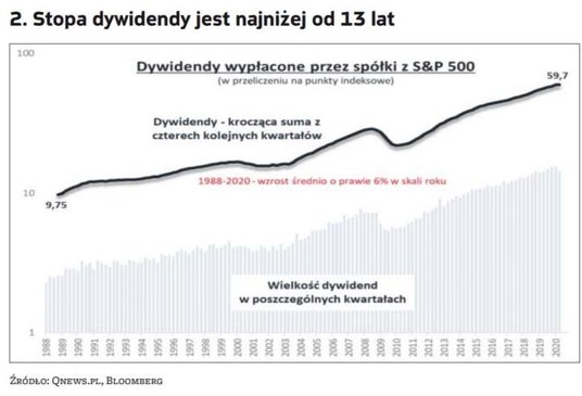 Innymi słowy, inwestor – kupując odpowiednio zdywersyfikowany koszyk amerykańskich walorów – może liczyć, że w długim terminie będzie inkasował coraz to większe dywidendy. Warto zauważyć, że jest to podstawowa różnica (i zaleta) względem klasycznych instrumentów dłużnych (obligacji), w przypadku których odsetki są na stałym poziomie.