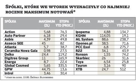 Energa, GPW, KGHM czy Tauron to tylko przykładowe spółki o większej kapitalizacji, które podczas wtorkowej sesji wyznaczyły co najmniej roczne maksimum notowań. W sumie podczas ostatniej sesji zrobiły to aż 23 podmioty z szerokiego rynku. Średnia stopa zwrotu z ich akcji, licząc od początku roku, sięga aż 109 proc., a nowe maksima sugerują, że dotychczasowe trendy będą kontynuuowane. Na korzyść takiego scenariusza przemawia też fakt, że 239 podmiotów ma obecnie wycenę wyższą niż 200-sesyjna średnia krocząca, będąca swego rodzaju granicą długoterminowego przesilenia.