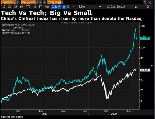 ChiNext jest spółką zależną podobną do NASDAQ na giełdzie w Shenzhen. Pierwsza grupa firm rozpoczęła handel na ChiNext 30 października 2009 r. Od dołka pod koniec marca urósł dwukrotnie mocniej niż amerykański odpowiednik. Wskaźnik gwiazd technologicznych w Shenzhen - gdzie dynamika była rekordowa i silniejsza niż którykolwiek z 93 benchmarków na świecie - spadł aż o 3,5 proc. Poprzedniego dnia zostały ujawnione plany sprzedaży akcji przez fundusze wspierane przez rząd. Spadał nie tylko ChiNext. Akcje chińskie spadły najbardziej od pięciu miesięcy, ponieważ oznaki nierównomiernego ożywienia gospodarczego wstrząsnęły inwestorami już zaniepokojonymi szybkim wzrostem na krajowych giełdach. Benchmark Shanghai Composite spadł w czwartek o 4,5 proc. Oznacza to, że spadł teraz na cztery z ostatnich pięciu sesji, po wzroście od końca czerwca na fali optymizmu, że Chiny otrząsnęły się z najgorszych skutków koronawirusa.