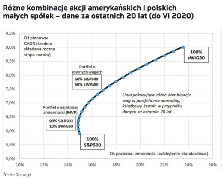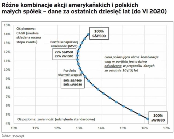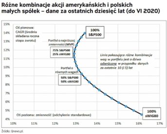 Wybrzuszenie linii osiąga największy rozmiar w punkcie, który nazywany jest MVP (ang. minimum variance portfolio), czyli portfelem o najniższej zmienności. Gdybyśmy chcieli osiągnąć jak najmniejszą zmienność (ryzyko) koszyka, to powinniśmy do akcji amerykańskich dołożyć od 10 proc. (wg danych za ostatnie 20 lat) do nawet 25 proc. (dane za 10 lat) polskich „maluchów".