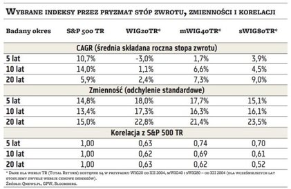 Jak to możliwe? Klucz do wyjaśnienia tej zagadki tkwi w... korelacjach. Jak pokazujemy w tabeli, amerykańskie i polskie akcje nie były w żadnym z historycznych okresów mocno skorelowane ze sobą. Współczynnik korelacji w przypadku np. omawianego sWIG80 wynosił od 0,52 do 0,70. To nie tak dużo, biorąc pod uwagę, że przecież w jednym i drugim przypadku mówimy o tej samej klasie aktywów, czyli o akcjach (dla przypomnienia, z perfekcyjną korelacją mamy do czynienia, gdy współczynnik równa się 1,00).