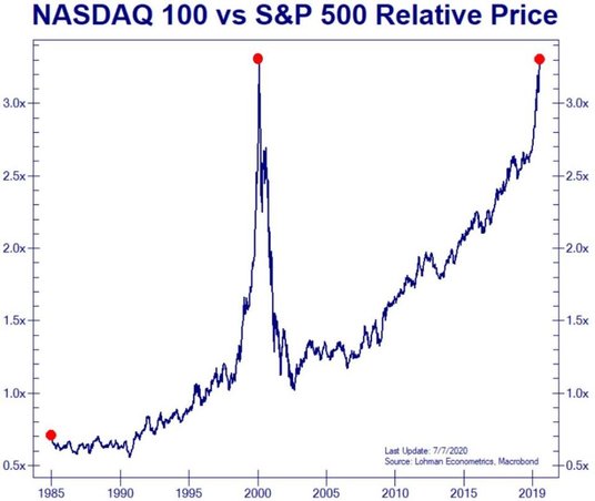 Do tej pory jednak Nasdaq wspinał się na kolejne szczyty, ignorując dane o pandemii. Również na to wskazywał początek wtorkowej sesji. Indeks kontynuował gwałtowny wzrost do nowych szczytów po drugim z rzędu dniu dobrych wyników na chińskich akcjach. Wzrost wynikał z notowań akcji takich jak Tesla, która jest w drodze do piątego z rzędu rekordowego dnia. Kurs zamknął się we wtorek na poziomie 1 389,86 punktu, po wzroście o 1,33 proc. Jak pisaliśmy, inwestorzy na Wall Street na potęgę kupują akcje spółek technologicznych, czego efektem jest wzrost notowań Nasdaqa o 52 proc., licząc od marcowego dołka do 10433 pkt. Wyceny Tesli czy Amazona przebijają kolejne bariery psychologiczne i są najwyżej w historii. Na notowania największy wpływ mają największe amerykańskie spółki technologiczne - Netflix, Amazon, Google, Tesla, Microsoft i Apple odpowiadają za około 40 proc. kapitalizacji całego indeksu.