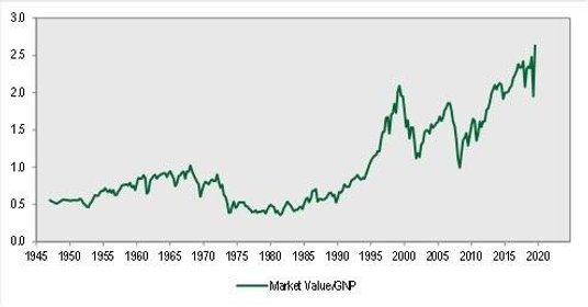 Jak wspieranie gospodarki wpływa na ceny akcji? Można oczekiwać, że rząd będzie wspierał akcje do czasu, gdy stosunek kapitalizacji rynkowej do PKB osiągnie 2,75x. Giełdy są zbyt duże, aby upaść.
