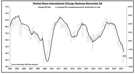 Ekonomiści ankietowani przez Econ Today oczekiwali silniejszego odbicia do 44,5 z 32,3 w maju. Każdy odczyt poniżej 50 wskazuje na pogorszenie warunków. W szczegółach wzrost produkcji i nowych zamówień przyniósł spadek dostaw i zatrudnienia. Przedsiębiorcom zdano dodatkowe pytanie - jakie są ich plany kadrowe na resztę roku. Większość (55,8%) planuje zamrożenie zatrudnienia, a 23,3% spodziewa się zwolnienia pracowników. Tylko 18,6 proc. respondentów planuje poszerzanie siły roboczej. Chicago PMI jest ostatnim regionalnym wskaźnikiem produkcji przed opublikowaniem krajowych danych ISM za czerwiec.