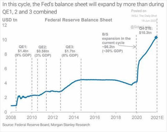 Rezerwa Federalna zaczęła zakupy aktywów na początku marca nie ogłaszając – jak w poprzednich rundach luzowania ilościowego – jak długo zakupy będą trwały i jaka będzie ich wartość. Bilans Fed od końca lutego do początków czerwca wzrósł o 3 bln dolarów, co oznacza, że dziennie bank kupował aktywa wartości ponad 30 mld USD – podsumowuje portal alebank.pl.