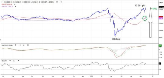 Od marcowego dołka do dzisiejszego maksimum indeks sWIG80 wzrósł już o 47 proc. Indeks odrobił całość strat po lutowo-marcowym załamaniu i znalazł się dziś najwyżej od dwóch lat. Skala wzrostu jest tak duża, że średnie z 50 i 200 sesji utworzyły formację złotego krzyża, która należy do długoterminowych sygnałów popytowego przesilenia. Korekta z ubiegłego tygodnia pokazała, że część inwestorów zrealizowała zyski przy lutowym szczycie, ale szybkie odrobienie strat sugeruje, że kapitał wciąż płynie do tego segmentu szerokim strumieniem. Oscylatory MACD i RSI(14) cały czas pokazują wykupienie, ale od połowy kwietnia ta sygnalizacja jest ignorowana.