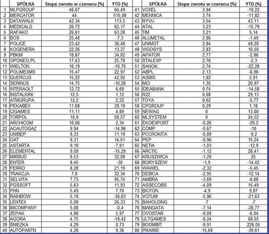 Licząc od początku czerwca do wtorkowego zamknięcia sWIG80 jest już prawie 7 proc. na plusie. Spośród 80 spółek wchodzących w jego skład aż 31 ma lepszy wynik, sięgający od 7,7 proc. (Selvita) do 46,7 proc. (MLP Group). Ponad 20 proc. zyskały też Kogeneracja, Police, BOŚ, Rafako, Medicalgorithmics, DataWalk i Mercator. Pod kreską od początku czerwca jest 20 maluchów, a straty sięgają od -0,3 proc. (Eko Export) do -15,7 proc. (Prairie Mining). Ponad 5 proc. pod kreską są także Votum, BAHolding, Mangata, Ovostar, Ultimate Games i Boombit.