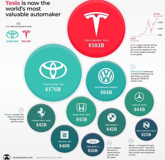 W ciągu ostatniego roku wartość rynkowa Tesli wzrosła o 375 proc. Notowany na Nasdaq producent elektrycznych samochodów wart jest obecnie 183 mld dolarów. Dorównać mu jest w stanie tylko Toyota (NYSE), której wartość wynosi 176 mld dolarów. Zupełnie inaczej wygląda porównanie ubiegłorocznej sprzedaży na rynku amerykańskim: Toyota – niemal 2,4 mln aut, Tesla – nieco ponad 192 tysiące.