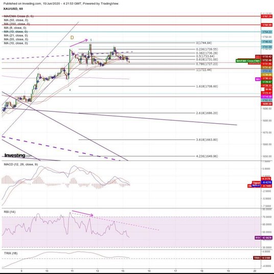 Z analiz wynika, że notowania złota przygotowują się do spadku. Jeśli przebije cenę 1722 dolarów za uncję, punktem oporu będzie 1708 dolarów. Jeśli notowania nie pójdą w górę, trzeba przygotować się na spadek nawet do 1600 dolarów. Marzeniem może być cena 1663 ewentualnie 1649 dolarów. W miniony piątek notowania kruszcu sięgnęły w porywach 1751 dolarów za uncję, po czym zaczęły spadać. Ubiegłotygodniowy szczyt miał miejsce w czwartek – 1753,70 dolarów za uncję. Niemal cały tydzień notowania złota rosły, szczególnie wraz z czwartkowymi spadkami indeksów na Wall Street. Natychmiast ten szlachetny metal znów zaczął wracać do roli bezpiecznej przystani, ale kiedy w piątek zaczęły się pojawiać odreagowania przecen na rynkach akcji, notowania złota znów zaczęły iść w dół. - Do przeceny na rynku przyczyniło się ryzyko drugiej fali Covid-19 w Stanach Zjednoczonych i niektórych innych krajach, takich jak Izrael, a także potwierdzenie, że ożywienie w kształcie litery V stanowiło złudne nadzieje - komentował Christopher Dembik, dyrektor ds. analiz makroekonomicznych w Saxo Banku.