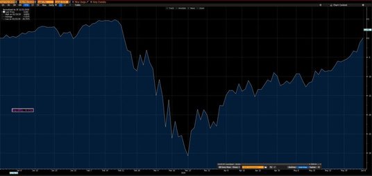 Amerykańskie indeksy szybko wróciły w okolice historycznych szczytów. Zdaniem analityków, aż prosi się co najmniej o techniczna korektę, jeśli nie o nową falę spadkową. Patrząc na indeks S&P 500 niektórzy analitycy twierdzą, że czasem porusza się dokładnie zgodnie z analizą techniczną. Jak komentuje Kamil Cisowski, analityk DI Xelion, w poniedziałek rynek amerykański zamykał się w okolicach dziennych maksimów. S&P500 zyskał 1.20 proc. Zauważa jednak, że Bloomberg zwraca uwagę, że w głównym indeksie nie ma już literalnie żadnej spółki, która w ciągu ostatnich 10 tygodni nie przyniosła dodatniej stopy zwrotu, co wydaje się bardziej niepokojącym sygnałem niż sam fakt wyjścia głównego indeksu na dodatnie poziomy YTD (year to date).