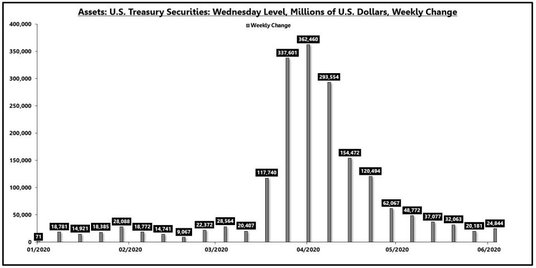 Skup obligacji skarbowych przez Fed maleje od kwietnia. Ówczesny rekord to niemal 362,5 mld dolarów w ciągu tygodnia. Na przełomie maja i czerwca nie przekracza 30 mld dolarów tygodniowo. Amerykańska Rezerwa Federalna uruchomiła na początku kwietnia tymczasowy mechanizm repo, pozwalający innym bankom centralnym wymieniać obligacje rządowe na dolary. Ma to zapewnić odpowiednią dużą ilość amerykańskiej waluty w globalnym systemie finansowym. Jak pisaliśmy, Fed w ten sposób chce też zapobiec nadmiernemu umocnieniu się dolara.