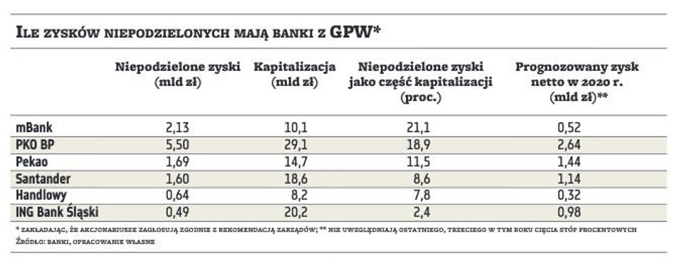 PKO BP celował przed pandemią w wypłatę połowy zysku z 2019 r., a akcjonariuszy miała jeszcze rozpieścić dywidenda z niepodzielonych zysków, co łącznie miało dać stopę dywidendy rzędu 8 proc. Pandemia przekreśliła te plany i PKO BP, jeśli akcjonariusze zgodzą się z rekomendacją zarządu, będzie miał 5,5 mld zł niepodzielonych zysków.