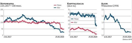 Za powrotem teraz do pomysłu fuzji miałyby przemawiać dwa główne czynniki: głębszy spadek wyceny Aliora (przez dwa lata o ponad 80 proc., do 1,75 mld zł) niż Pekao (48 proc., do 13,5 mld zł), co zmieniłoby ewentualny parytet wymiany akcji na korzyść tego drugiego banku, oraz popadnięcie przez Aliora w problemy. Dzisiaj kurs akcji Aliora wynosi 13 zł, a Pekao jest prawie czterokrotnie wyższy (51,4 zł). W sierpniu 2018 r. było to odpowiednio 75 zł i 105 zł. Fundamentalna przesłanka za fuzją to chęć nie tylko uporządkowania wreszcie banków w grupie PZU, ale też zapobieżenia głębszym problemom Aliora. Zdaniem analityków bank ten będzie miał duże trudności, bo dostał w ostatnim roku trzy duże ciosy: tzw. małe TSUE (ograniczenie prowizji pobieranych w razie spłaty kredytu przed terminem), które obniżyło jego rentowność o jedną trzecią, a do tego doszedł wzrost odpisów i bijący w przychody spadek stóp procentowych (Alior jest pod tymi względami jednym z najbardziej wrażliwych w sektorze). Haitong prognozuje ponad 150 mln zł straty netto Aliora w tym roku, co nie pomogłoby jego i tak napiętej już sytuacji kapitałowej.