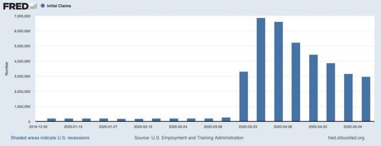 Przyrost nowych wniosków o zasiłek dla bezrobotnych ustabilizował się w Stanach Zjednoczonych na bardzo wysokim poziomie – 2,98 miliona. To poziom zbliżony do liczby złożonych po raz pierwszy wniosków o zasiłek dla bezrobotnych w tygodniu do 9 maja było ich blisko 3 mln. Tydzień wcześniej złożono 3,2 mln wniosków. W szczycie kryzysu z 2008 roku aplikacji było 668 tys.