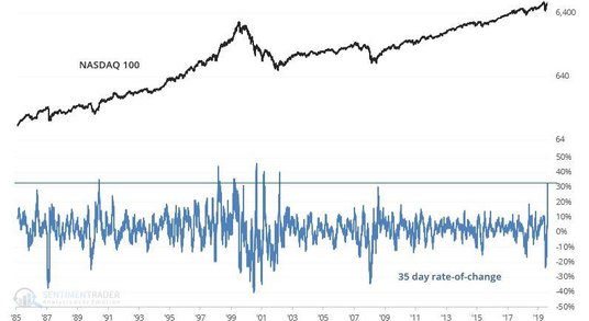 Przypadki historyczne czasami prowadziły do większych zysków krótkoterminowych w nadchodzących dniach, ale prawie wszystkie doprowadziły do strat amerykańskich akcji w nadchodzących tygodniach i miesiącach. Widać to na wykresie siedmiotygodniowych zmian indeksu Nasdaq 100.