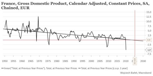 Biorąc pod uwagę roczny wzrost gospodarczy Francji od 1950 r., jego linearna ekstrapolacja wskazuje, że od 2025 roku większość czasu stopa wzrostu PKB będzie ujemna.