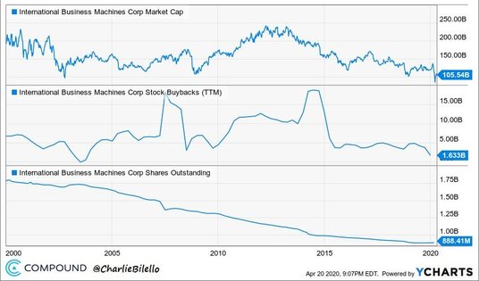 IBM prowadził buyback nieprzerwanie od początku wieku. Prowadziło to do sztucznego zawyżania wskaźnika zysku na akcję przy jednoczesnym spadku zysku netto spółki. W 2007 roku wydał na ten cel ponad 15 mld dolarów, co wywołało wzrost jego notowań o 4,53 proc., do 99,52 dolara. W 2014 roku skupił własne akcje za ponad niemal 14 mld dolarów. Były to dwa rekordowe lata. Przez cały czas wypłacał przy tym atrakcyjną dywidendę.
