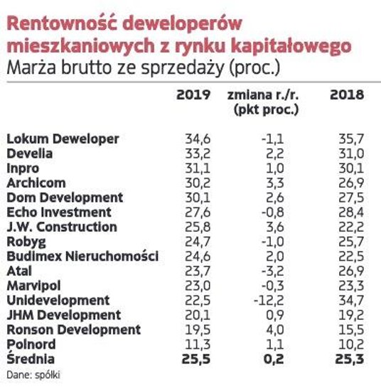 – Jeszcze rok temu mało kto zakładał utrzymanie marż z 2018 r., tymczasem niektóre spółki nawet poprawiły rentowność. Scenariusz bazowy zakładał, że deweloperom nie uda się przerzucić dynamicznych wzrostów cen materiałów budowlanych i robocizny na klientów. Stało się jednak inaczej. Utrzymanie wysokich marż w 2019 r. było możliwe dzięki utrzymującemu się sporemu popytowi na mieszkania. W ubiegłym roku w niektórych aglomeracjach popyt wyraźnie przewyższał podaż – mówi Wewiórski. Analityk nie przypomina sobie, by w 2019 r. były oddawane inwestycje z ujemną rentownością, nawet inwestycje realizowane na gruntach kupionych drogo, w okresie poprzedniej hossy, miały dodatnią rentowność. Zdarzały się też inwestycje z marżami mocno powyżej 40 proc.