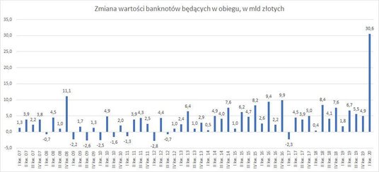 Od 2007 roku najwyższy wzrost wyniósł 11,1 mld zł. Zwiększone wypłaty gotówki z bankomatów i kas banków realizowane przez klientów chcących się zabezpieczyć na wypadek kolejnych obostrzeń związanych z pandemią znalazły odzwierciedlenie w statystykach Narodowego Banku Polskiego. NBP opublikował dane na temat liczby i wartości poszczególnych banknotów i monet znajdujących się w obiegu. Wynika z nich, że na koniec marca miały one łącznie wartość ok. 269,1 mld zł. Jak wyliczyła cytowana przez portal cashless.pl PAP, w ciągu minionego kwartału wartość gotówki w obiegu wzrosła o ponad 22 proc. w porównaniu do I kw. 2019 r. oraz o ponad 13 proc. w stosunku do IV kw. ubiegłego roku - i był to najwyższy wzrost od kryzysu finansowego z roku 2008.