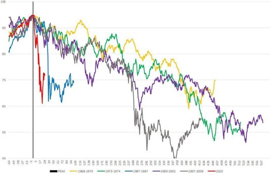 Czy to strojenie okien (window dressing), związane z końcem miesiąca i kwartału, czy formacja V i odwrócenie trendu? Historyczne dane wskazują, że indeks S&P 500 po szczytach w latach 1968-1970, 1973-74, 1987, 2000-2002 i 2007-2009 przez długi czas nie wracał na rekordowe poziomy. Owszem, po dołku następowały odbicia. W poniedziałek indeks zyskał 3,35 proc., a w całym ubiegłym tygodniu – ponad 10 proc. To jednak nie oznacza powrotu do wzrostów.