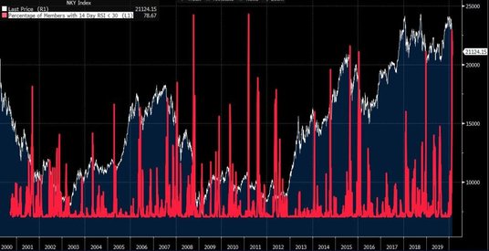 Jeśli ktokolwiek uważa, że wyprzedaż akcji na rynku amerykańskim to coś złego, niech spojrzy na to, co dzieje się w Japonii – zwracają uwagę analitycy. Oto wskaźnik siły względnej, RSI (oscylator określający siłę trendu w analizie technicznej) znalazł się dla 83 proc. z 225 spółek, wchodzących w skład indeksu Nikkei, poniżej 30. Gdy RSI znajduje się powyżej poziomu 70, oznacza to sygnał wykupienia rynku; gdy jest poniżej 30, jest sygnałem wyprzedania rynku). Taka sytuacja zdarzyła się na giełdzie japońskiej do tej pory tylko dwa razy: w październiku 2008 roku i w marcu 2011 r.