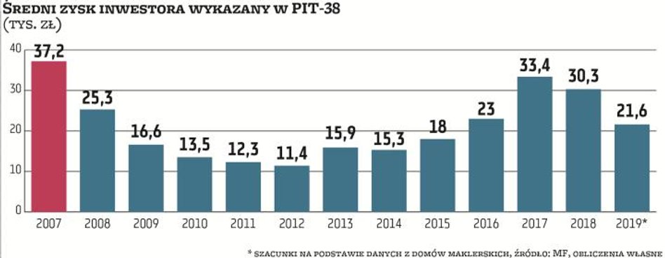 O ile spadek liczby „giełdowych" PIT-ów jest stosunkowo nieduży, o tyle w oczy rzuca się spadek wykazywanego zysku.