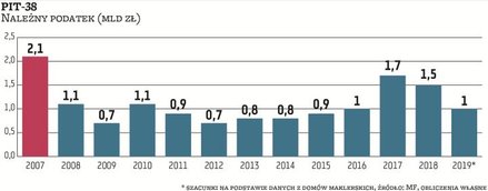 Jak jednak wiadomo, sytuacja rynkowa w ubiegłym roku była „wymagająca". To natomiast znalazło odzwierciedlenie w statystykach dotyczących „giełdowych" PIT-ów. Z szacunków „Parkietu", które zostały przygotowane na podstawie danych przekazanych przez domy maklerskie, wynika, że spadła zarówno liczba osób, które muszą rozliczyć się z fiskusem, jak i zysk, który udało się osiągnąć inwestorom. To oczywiście oznacza mniejszy wpływu do państwowej kasy z tytułu podatku od zysków kapitałowych.