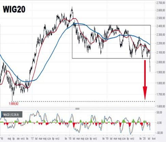 Gdyby więc trzymać się tych historycznych zależności, to najbardziej możliwy scenariusz zapowiada kontynuację spadku WIG20, który potrwa jeszcze około dwóch tygodni. Jego zasięg, licząc 9 proc. od zamknięcia poniedziałkowej sesji, to 1820 pkt. W wariancie optymistycznym straty powinny zostać odrobione do końca tego tygodnia, a w pesymistycznym na powrót do poziomu 2090 pkt przyjdzie nam czekać nawet siedem tygodni. W tzw. międzyczasie WIG20 mógłby dojść nawet do 1612 pkt (19,4-proc. spadek). Ten ostatni zasięg, co jest trochę niepokojące, jest zgodny z tym, co o wykresie indeksu blue chips mówi analiza techniczna. Forsując pułap 2000 pkt, indeks wybił się bowiem z szerokiej, długoterminowej konsolidacji, dając tym samym sygnał do przeceny rzędu 300–400 pkt (poziomy docelowe szacowane na podstawie szerokości konsolidacji).